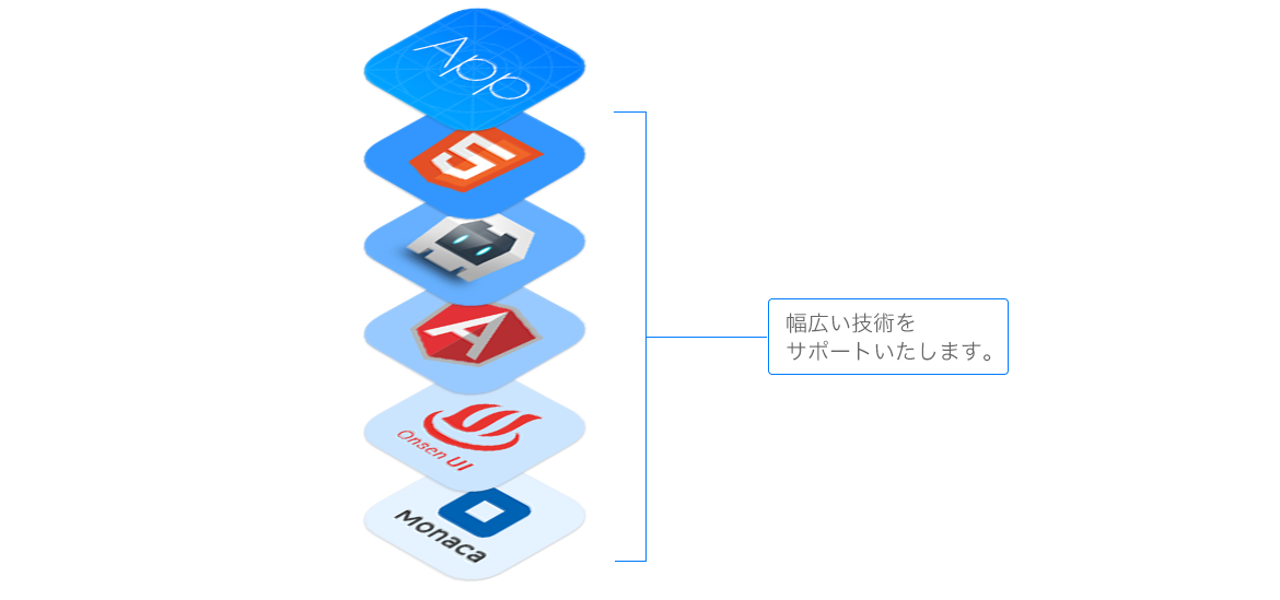 We offer end-to-end support for all kinds of technical challenges related to HTML5 hybrid app development. Asial provides full support for your app development projects, leveraging our proven experience and knowledge gained from developing Monaca and numerous other apps. We support a wide range of technologies including HTML5, Apache Cordova, Monaca, Onsen UI, AngularJS and more for your HTML5 hybrid app development.